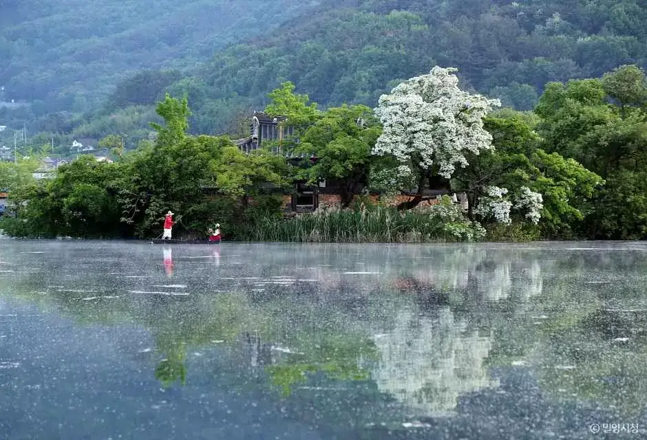 5월 초, 꽃이 만개한 시기에는 붉은 기와의 정자와 하얀 꽃이 강렬한 대비를 이루며 아름다운 장면을 만들어냅니다. 물에 비친 이팝나무와 정자 모습은 마치 한 편의 그림 같으며, 이른 아침이나 해 질 무렵에 방문하면 더욱 감성적인 사진을 남길 수 있습니다. 드라마 촬영지로도 활용되었던 만큼, 그 풍경은 이미 많은 이들의 마음을 사로잡은 명소입니다.